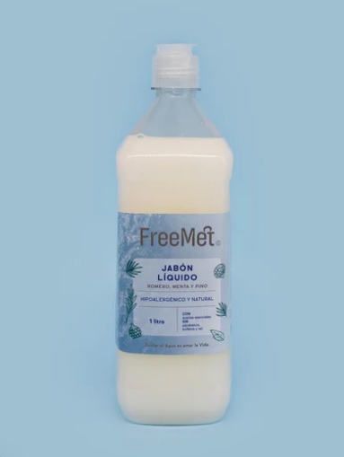 Jabón biodegradable, con envase de vidrio, que no contiene ingredientes que dañan la piel ni el medio ambiente. Posee gotas de aceite esencial de romero, menta y pino, que al unirse dejan la piel fresca y limpia. Además sus suaves agentes desengrasantes derivados del aceite de coco no resecan la piel.